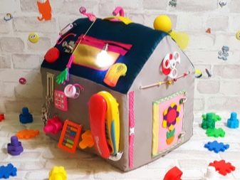 Этот вариант дороже, но и интереснее. Он представляет собой небольшую трехмерную модель дома или избушки. Часть элементов расположена снаружи, а часть – внутри. Малыш может даже залезть в такой домик и поиграть в прятки, потом укомплектовать его новыми игрушками.