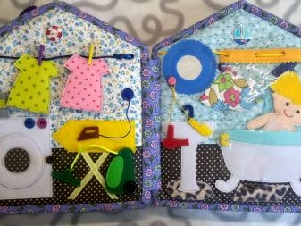Создайте интересные аппликации, применяя мягкие игрушки и объемные фигуры. Композиции можно подобрать на различную тематику, например, стирка-глажка, купание, кухонная тема и другие. Бизиборд можно создать в виде домика, если в общую нашивку не вписываются окна и дверь, то форма крыши ассоциативно укажет на это.