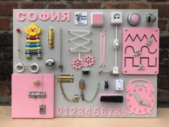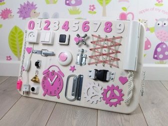 Бизиборд — вещь универсальная для детей обоих полов, но специально разработанный дизайн подчеркнет индивидуальность ребенка. Игровую доску для девочки можно окрасить в приятные пастельные оттенки теплых тонов, декорировать изображениями принцесс, цветов, животных, фей. Для маленькой девчушки можно оформить мягкую модель, а для более старшей — создать большую игровую поверхность с разнообразными предметами.