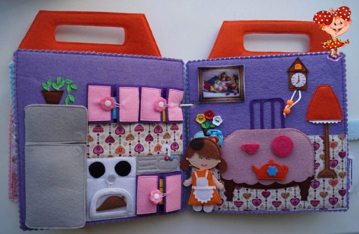 Создайте интересные аппликации, применяя мягкие игрушки и объемные фигуры. Композиции можно подобрать на различную тематику, например, стирка-глажка, купание, кухонная тема и другие. Бизиборд можно создать в виде домика, если в общую нашивку не вписываются окна и дверь, то форма крыши ассоциативно укажет на это.