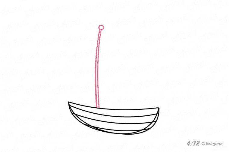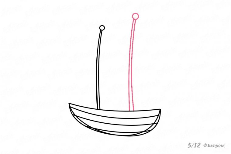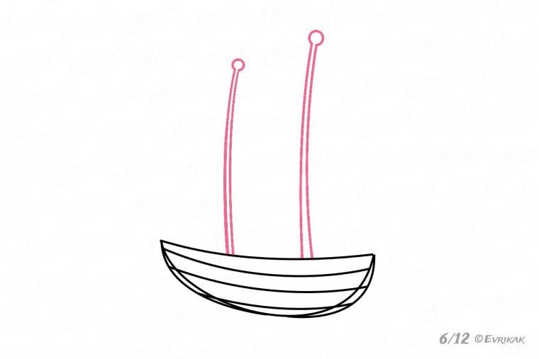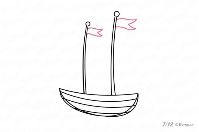 - Определяем центр судна. Проводим две параллельные линии, это мачта. К ней добавляем парусник. Проводим два отрезка вверху и внизу. Справа добавляем дугу. Левую сторону нужно сделать более изогнутой. К левой части корабля можно дорисовать весло.