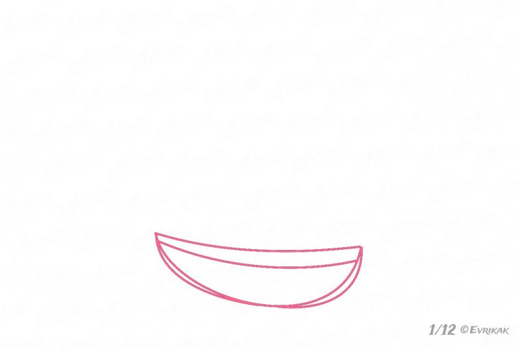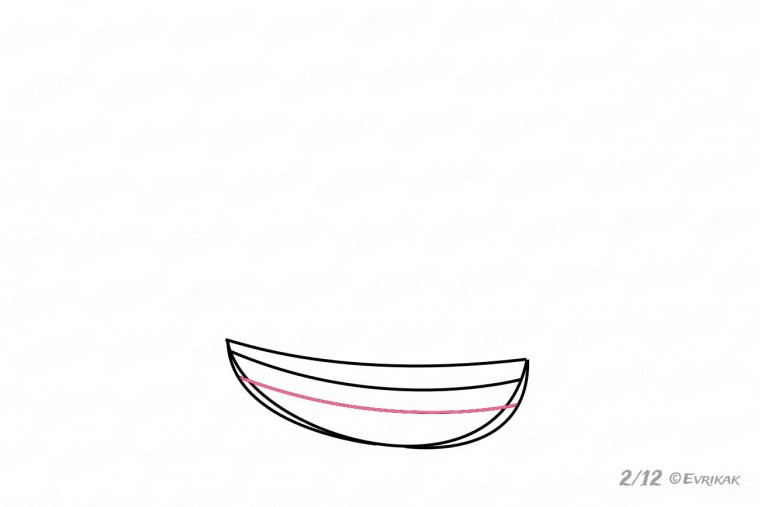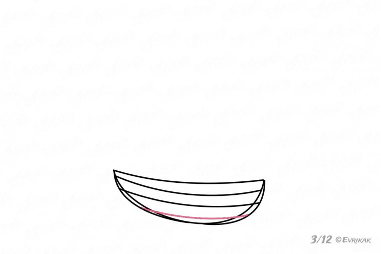 Обратите внимание, что с левой стороны конец имеет закрученную форму, а носовая часть украшена головой дракона, мы подробно рассматривали, как нарисовать его на megamaster.info. - Центральная часть судна изображается с помощью ровной линии, концы которой слегка завёрнуты вверх. Добавляем по корпусу несколько линий, которые обозначат доски корабля. Основная часть готова.