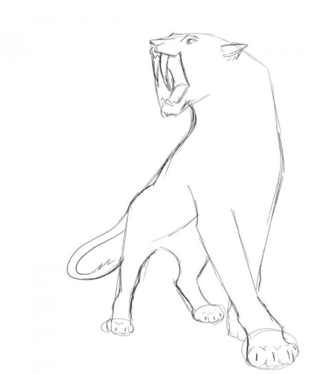 - Начинаем рисовать передние лапы зверя, обрисовывая с обеих сторон ранее нарисованные линии. Рисуем когти. Тут нужно будет потрудиться. Ничего сложного в обрисовке контура когтей нет, но на выполнение этой части рисунка понадобится некоторое время и внимательность. Когти добавят реалистичности зверю.