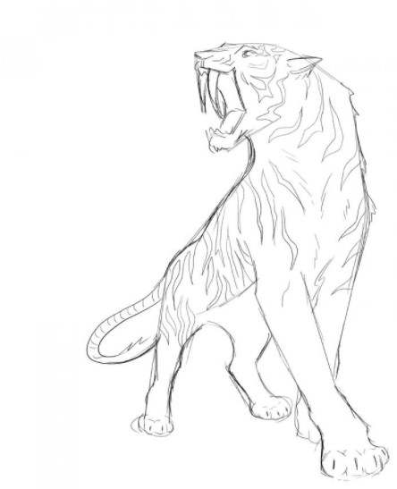 - Теперь, выводим контур тела. Дополняем изображение задней лапой с левой стороны туловища. Добавляем животному длинный хвост в задней части. По всему телу ставим полоски.