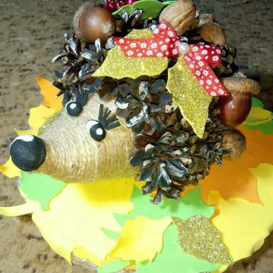 Очень красиво смотрится ежик, выполненный из осенней листвы и рябины.