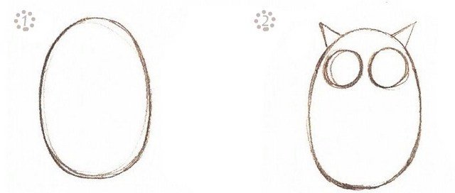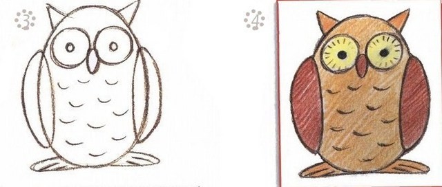 Но нарисовать сову можно несколько проще. Для этого посмотрите поэтапные рисунки и попробуйте сделать так же сами.