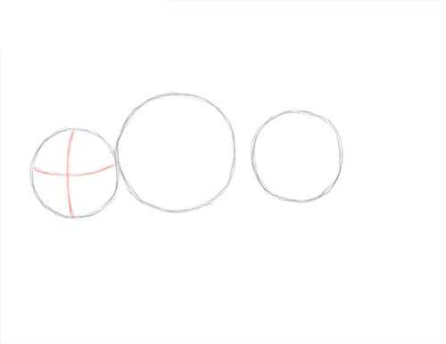 - Теперь пришло время прорисовать глазки и мордочку. Тонкими линиями прорисуйте глазки ан вспомогательной горизонтальной линии. По центру вертикальной линии в самом низу нарисуйте рот, немного выше овальный нос.