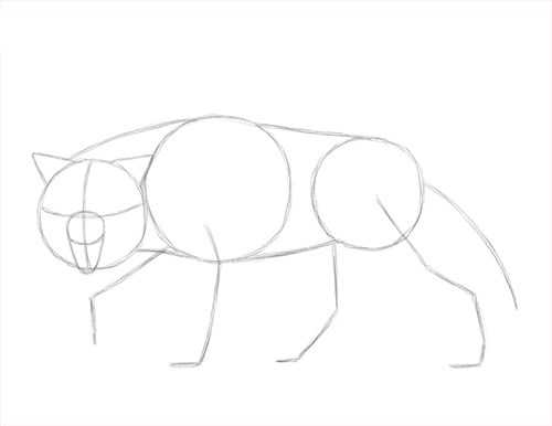 - Для начала необходимо определиться с формой тела зверя. Схематично прорисуйте корпус, сильно на карандаш не давите. Делайте легкие и тонкие штрихи. Нарисуйте горизонтальный овал, немного выгнутый снизу. Это будет туловище. От него прорисуйте две лапы вниз, пока что это просто должны быть полоски. Голову прорисуйте в виде круга, разделите его на четыре части. Туловище и голову соедините плавными линиями, сформировав шею.