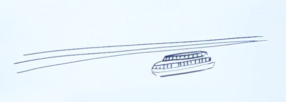 Прежде чем приступать к рисованию, многим может показаться сложным и даже немного приблизиться в исполнении подлинника на листе, но не стоит отчаиваться. Рисуем очертания корабля и затем берега в виде трех неровных линий.
