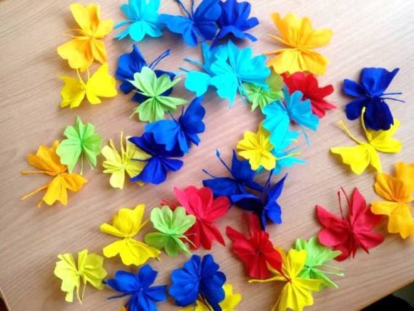 Вместо обычной цветной бумаги можно взять гофрированную. Эффект будет другой — она более легкая, воздушная, полупрозрачная, с ее помощью легко сделать декор бабочками объемным.