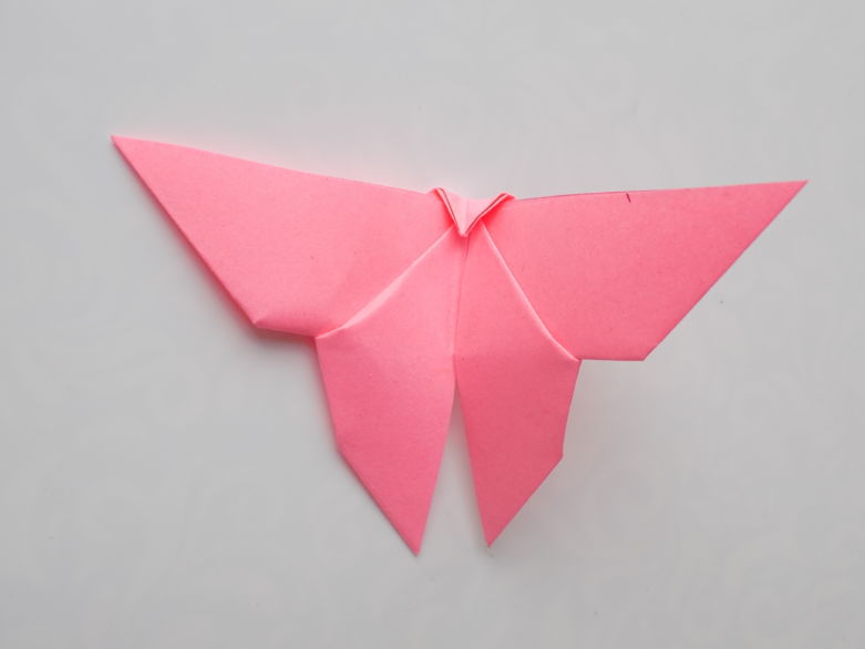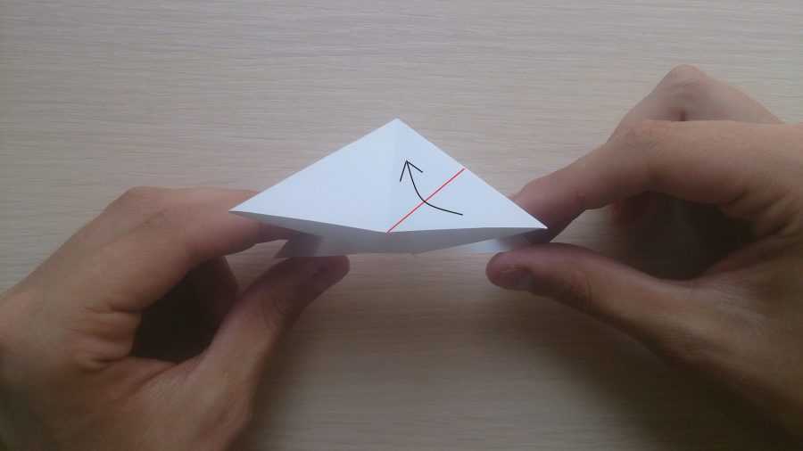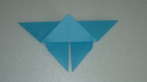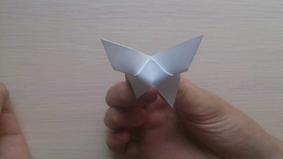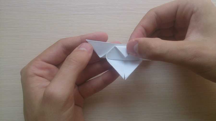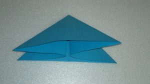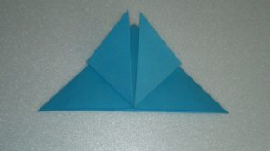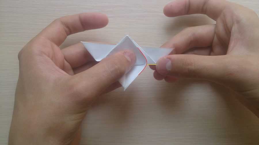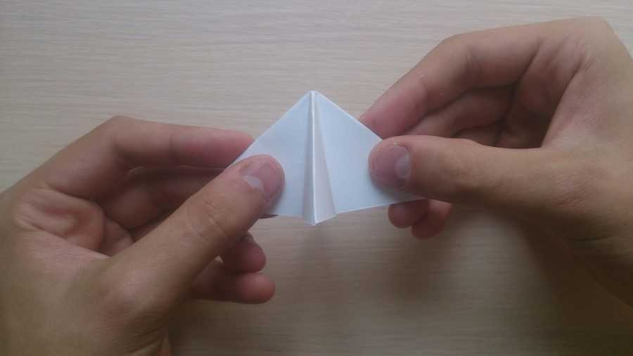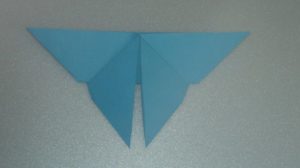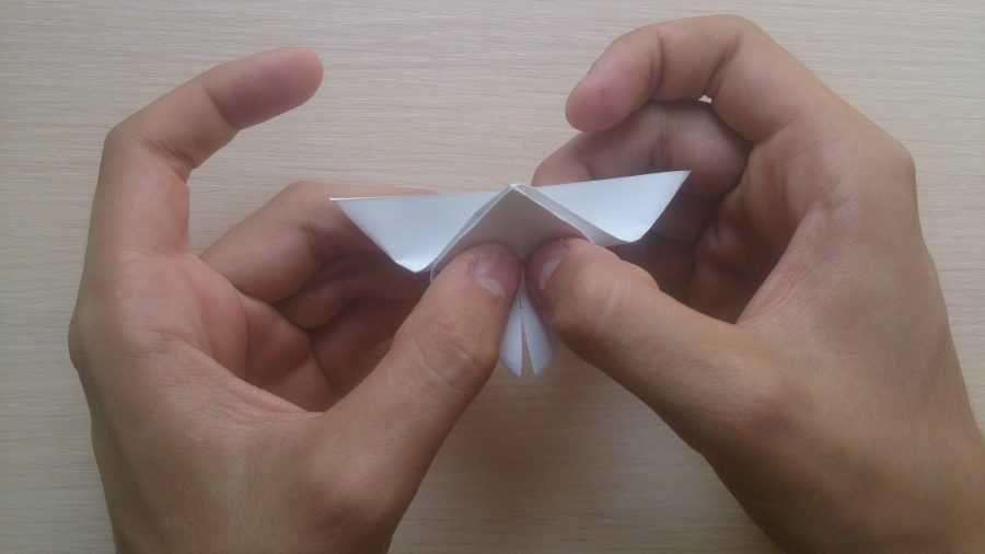 - Разверните заготовку. Приподнимите верхний слой и загните его книзу, делаем действие, с одной стороны, и с другой. Нижнюю деталь под крыльями загибаем вверх, треугольником, который выделяется вверху закрепляем поделку.