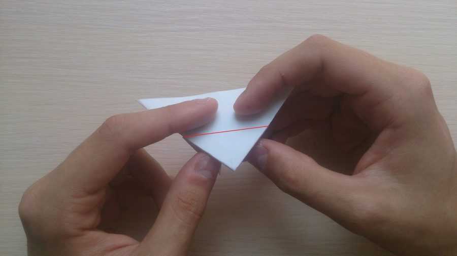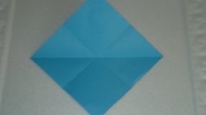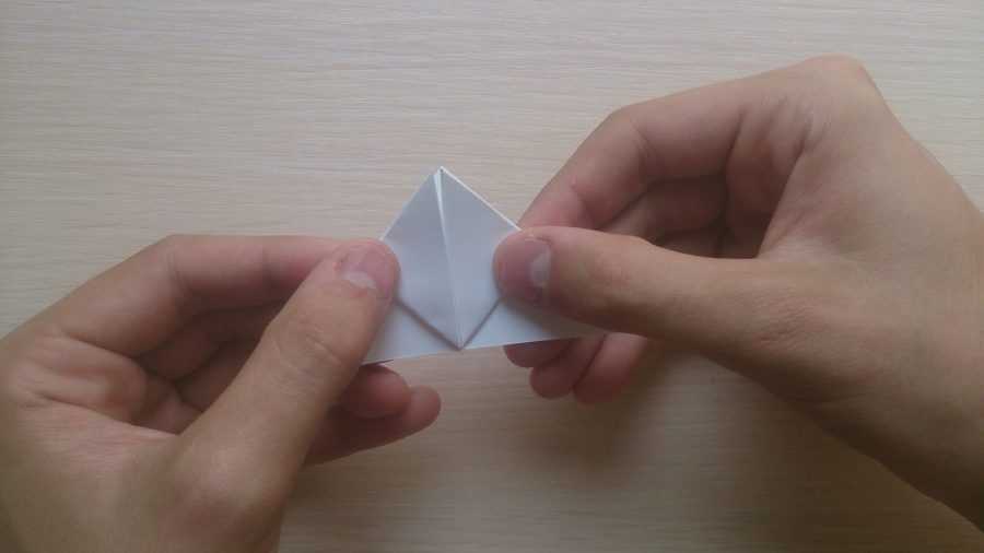 - Развернуть заготовку и сложить в прямоугольник и затем в квадрат. Снова развернуть и сложить двойной треугольник углами вовнутрь.