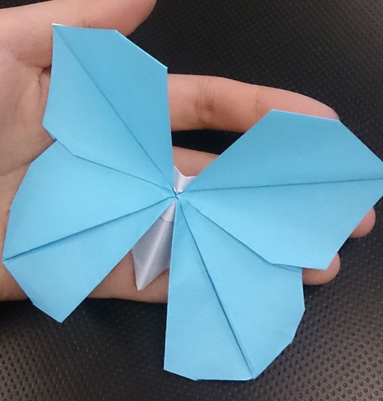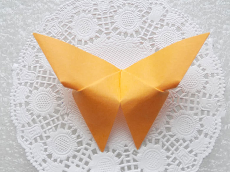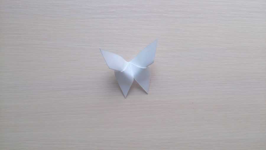 - Внешние треугольные концы отогнуть в обратном направлении. Концами ножниц расправить крылья изнутри.