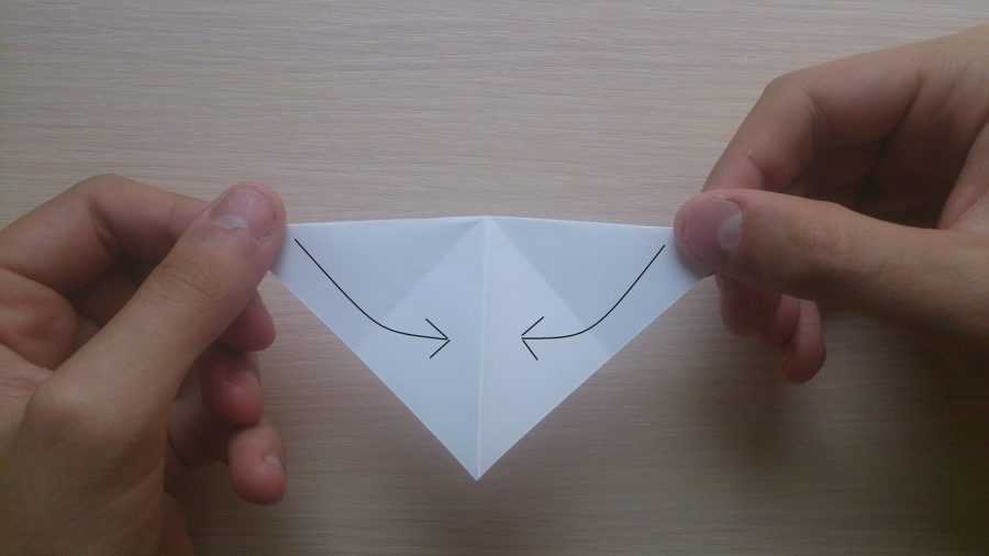 - Перевернуть работу и положить свободными концами к себе. Боковые части сложить в центр встык. Их после этого раскрыть, а внутренние нижние уголки отогнуть от центра.