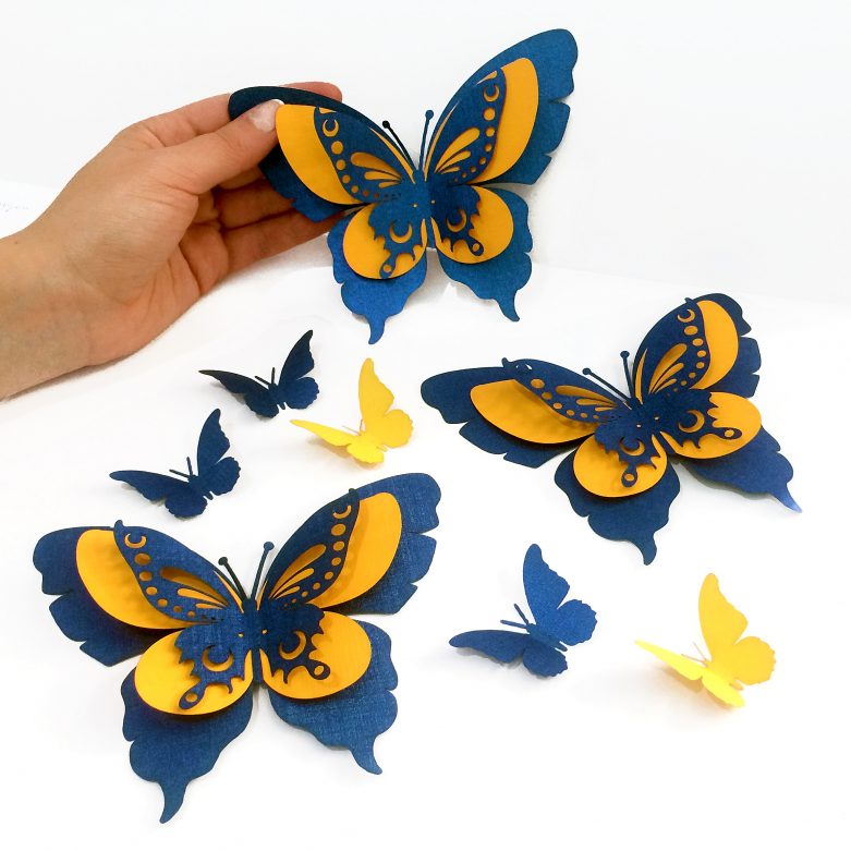 Чаще всего объемных бабочек для декора делают из двусторонней цветной бумаги или бумаги для скрапбукинга.