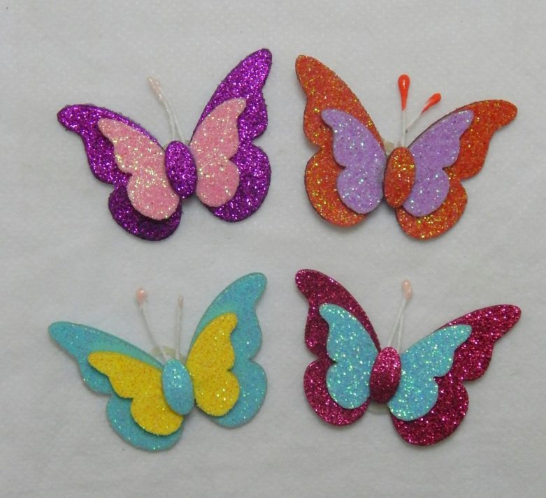 Картон используют не очень большой плотности. Это скорее очень плотная бумага. Он тоже есть цветной и двусторонний. С его помощью чаще делают объемный декор — загнуть крылышки относительно корпуса можно легко. Этот материал даже лучше держит форму. Только стоит помнить, что гофрированные крылышки уже не сделаешь — слишком жесткий материал для того, чтобы можно было сделать мелкую складку.