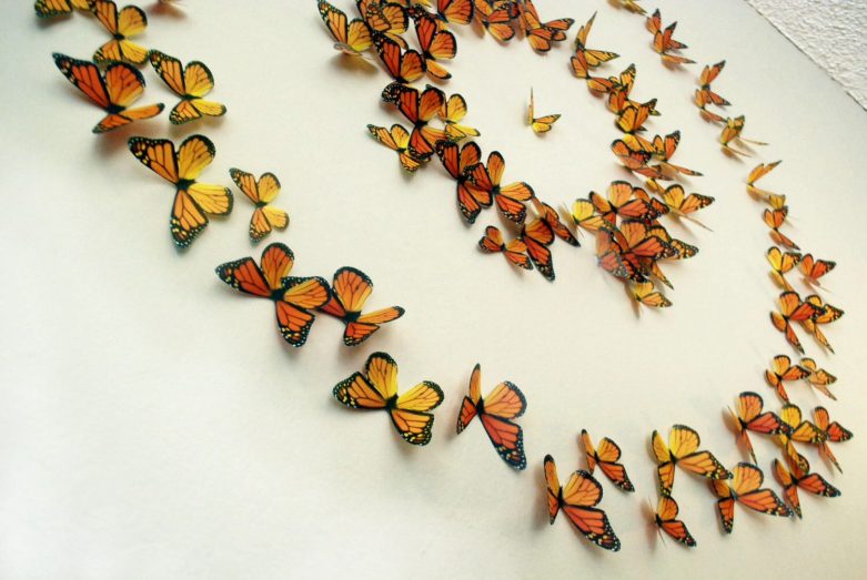 - Приклеить на магнитики и украсить дверь холодильника множеством объемных бабочек.