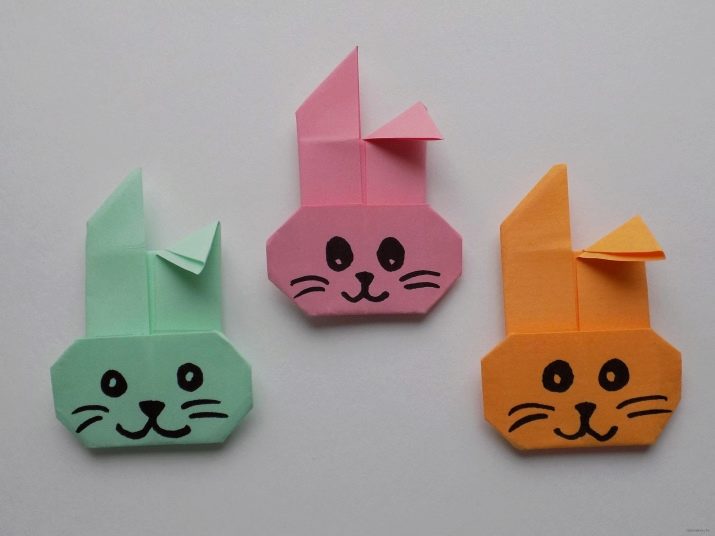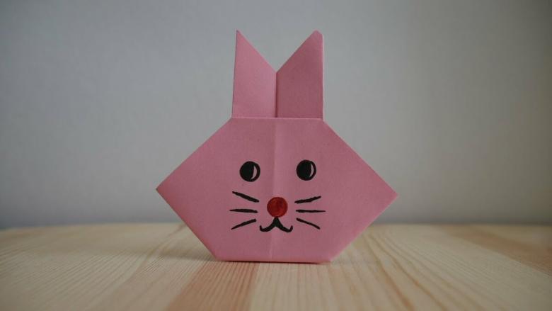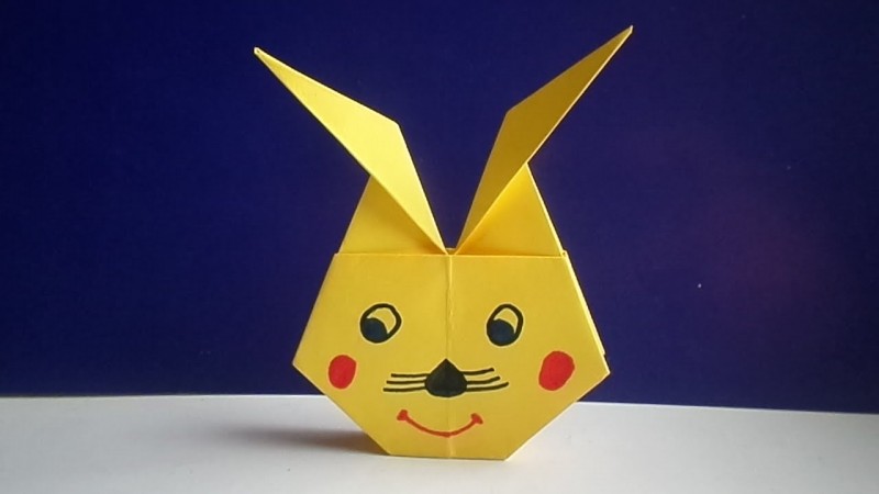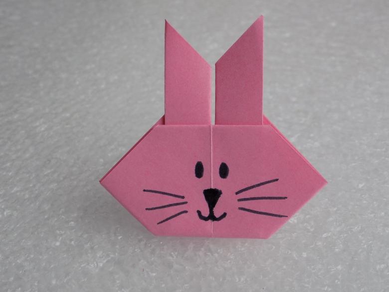 - Зайчик из бумаги оригами готов. Можно нарисовать ему глазки, нос и усы.