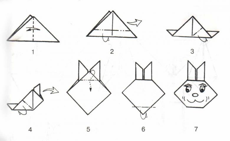 Подготовьте квадратный лист бумаги и сделайте зайчика, следуя пошаговой схеме.