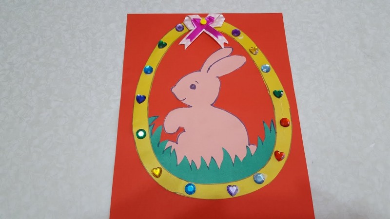 В его верхнем левом углу нарисуйте заячью мордочку. Проведите от правого угла до левого угла линию, а в полоске над ней нарисуйте розовую часть ушек зайчика. Чтобы поделка была впечатляющей, раскрасьте лист с рисунком красками, карандашами или с помощью штампа. Теперь, чтобы изготовить игрушку, выполните следующие действия: