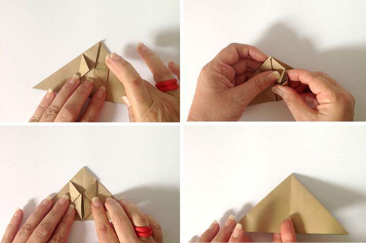 - Углы, которые получились на сгибе, согните вниз к открытому углу.
