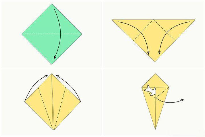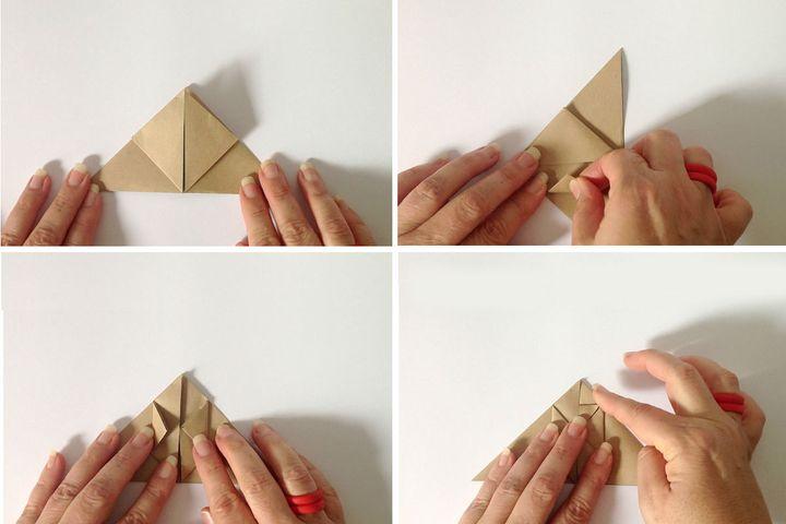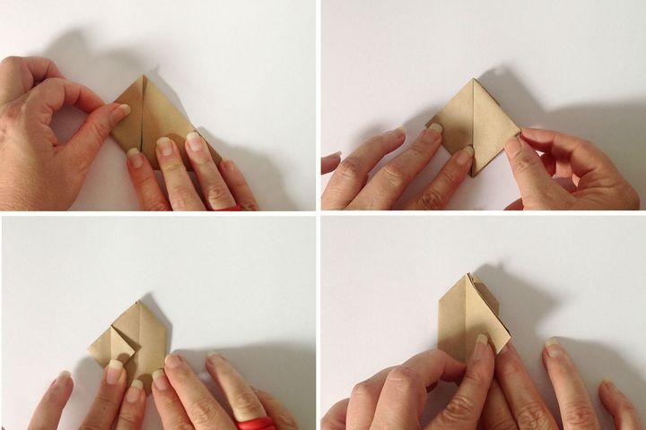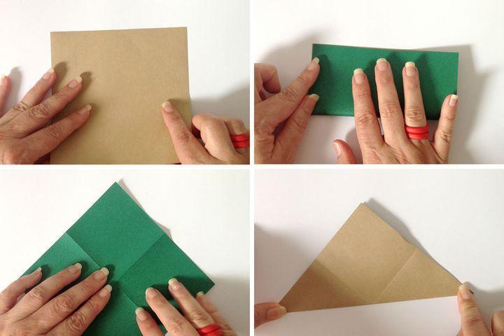 - Сложите заготовку противоположными углами пополам, так чтобы получился треугольник.
