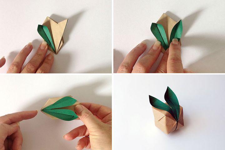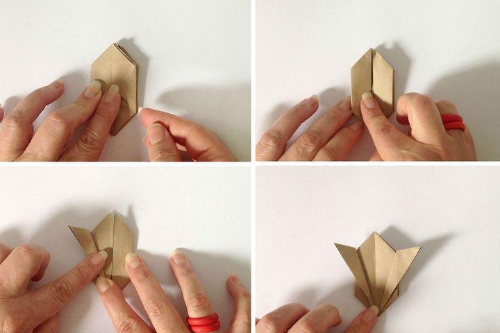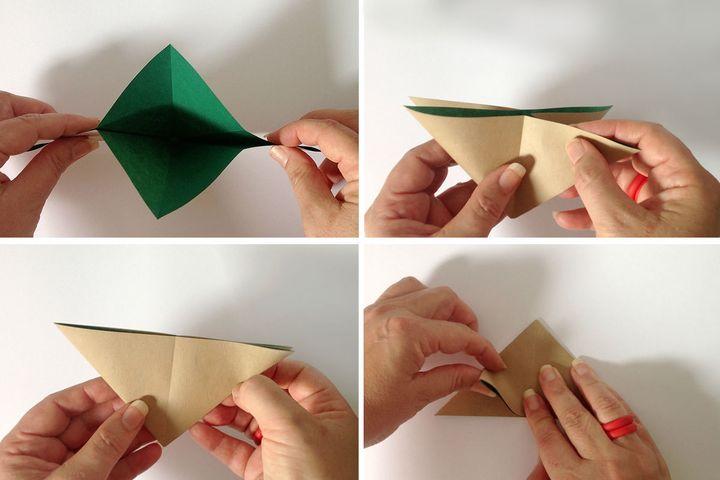 - Раскройте внутренние углы наружу. Получились ушки зайца.