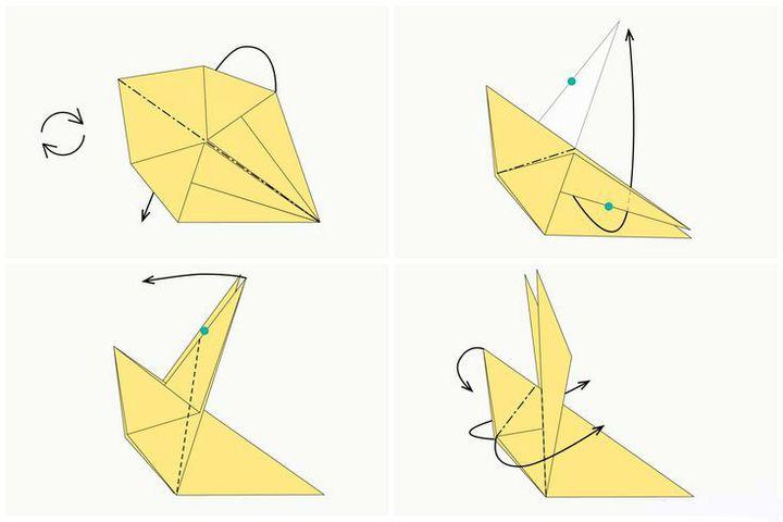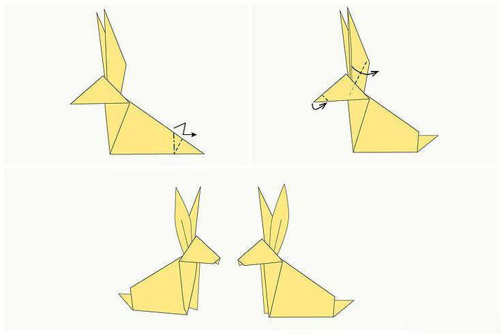 - Сделайте сгиб «горой», затем «долиной» по указанным на схеме линиям. Нажмите на верхний острый угол вниз, сдвиньте его назад, «надевая» на тело зайца.