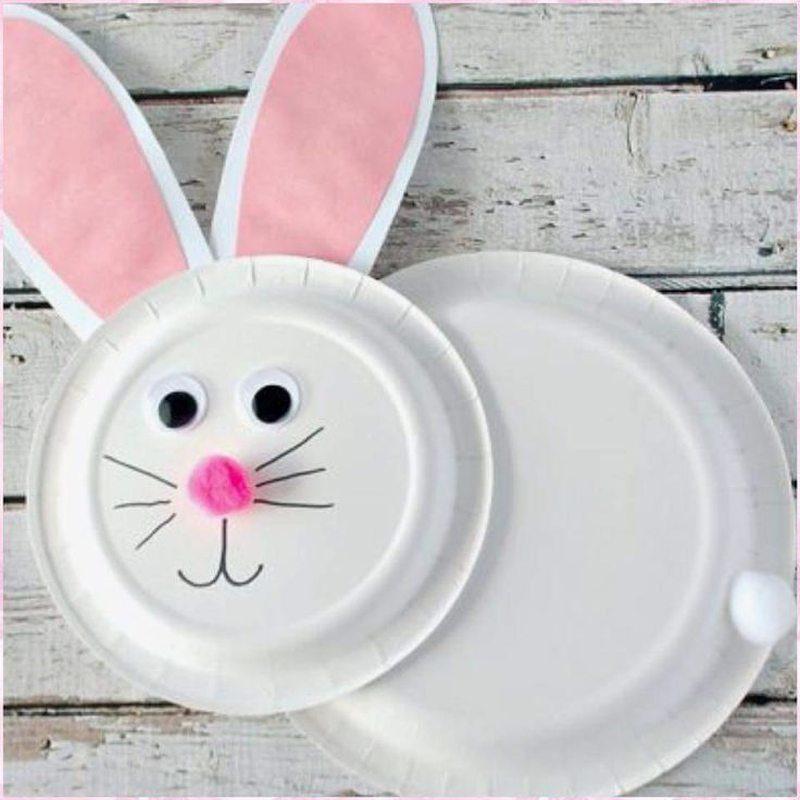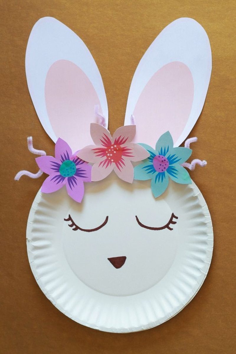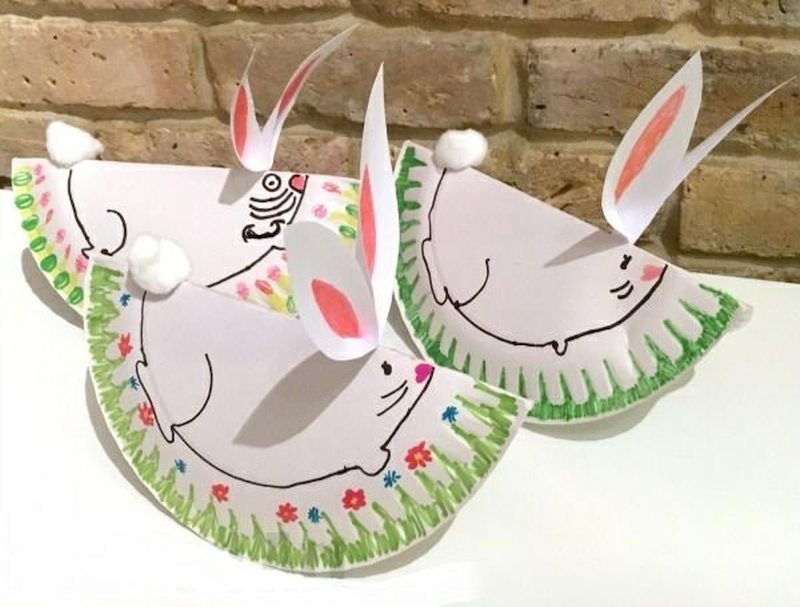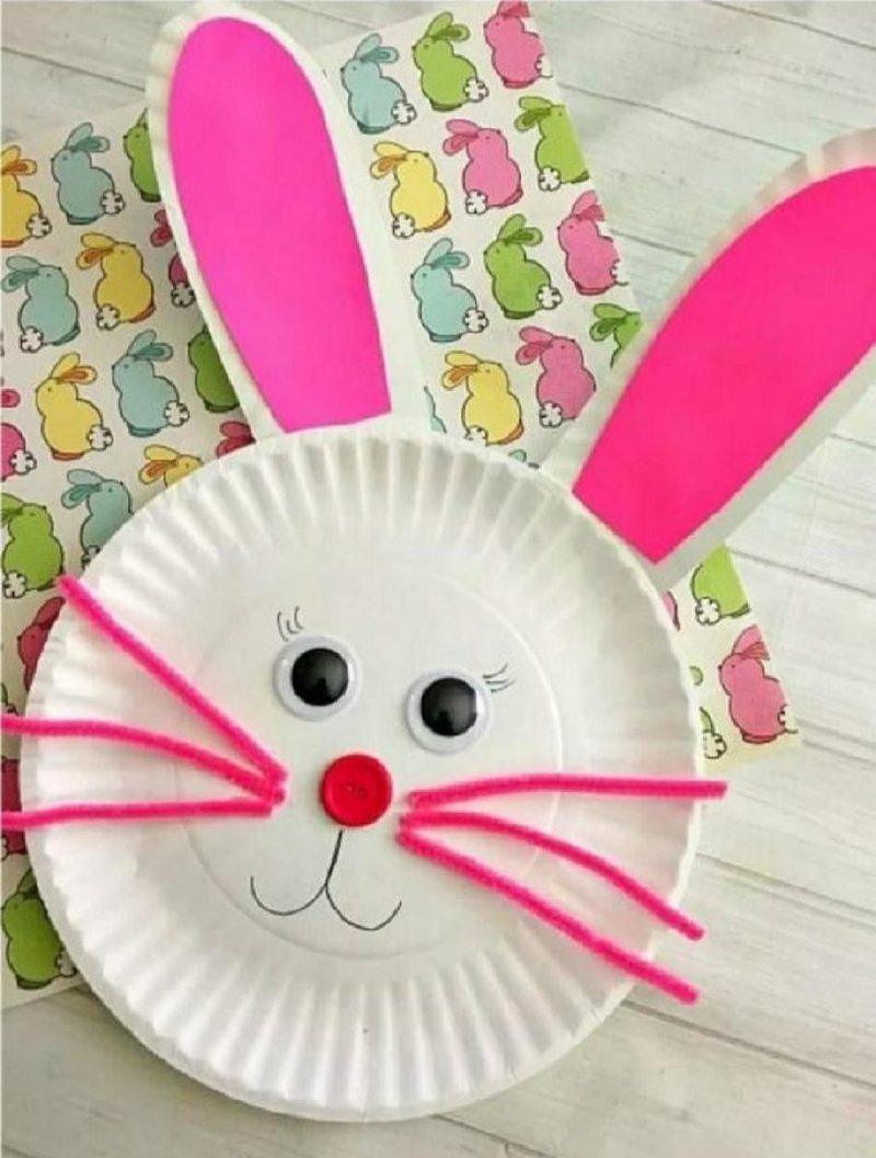Мордашку кролика нужно просто нарисовать на тарелке, как на альбомном листе. Либо выполните её в технике аппликации и не рисуйте, а наклейте усы, рот, нос, глаза. Длинные уши в любом случае вырежьте из второй тарелки или куска картона, приклейте с изнанки.