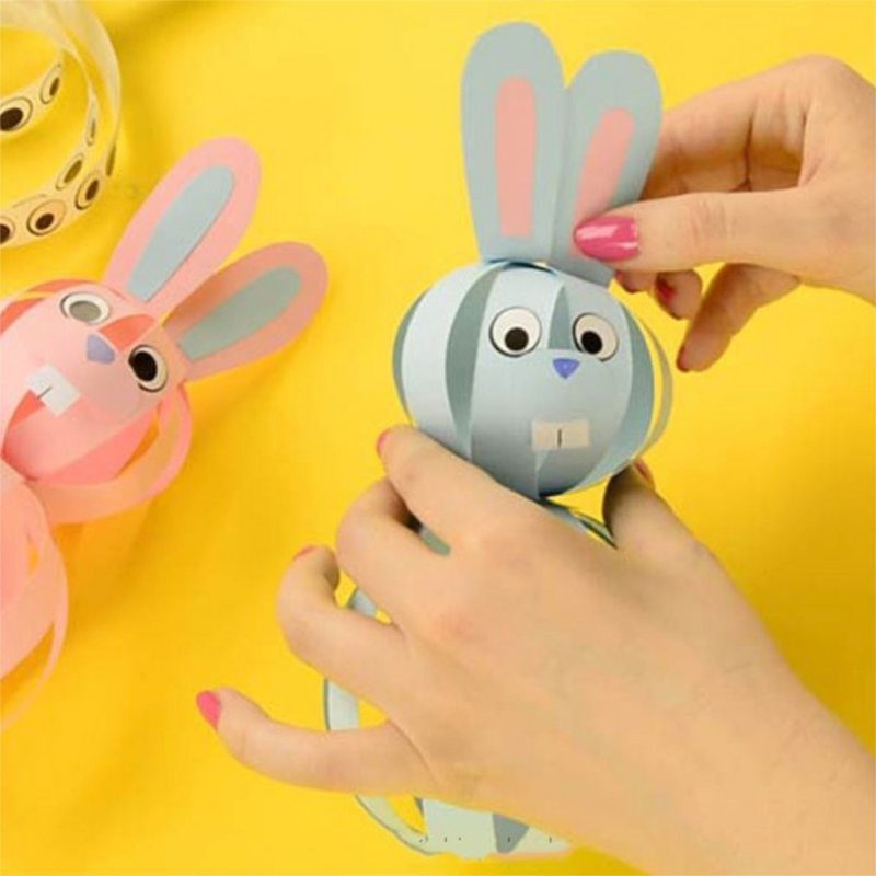 Из объёмных моделей легко изготовить подвесной мобиль. Бумажных зайцев с помощью ниток закрепляют на основе-кольце, например, на деревянных пяльцах для вышивания. Бумагу лучше использовать двухстороннюю, тогда модели выглядят интереснее.